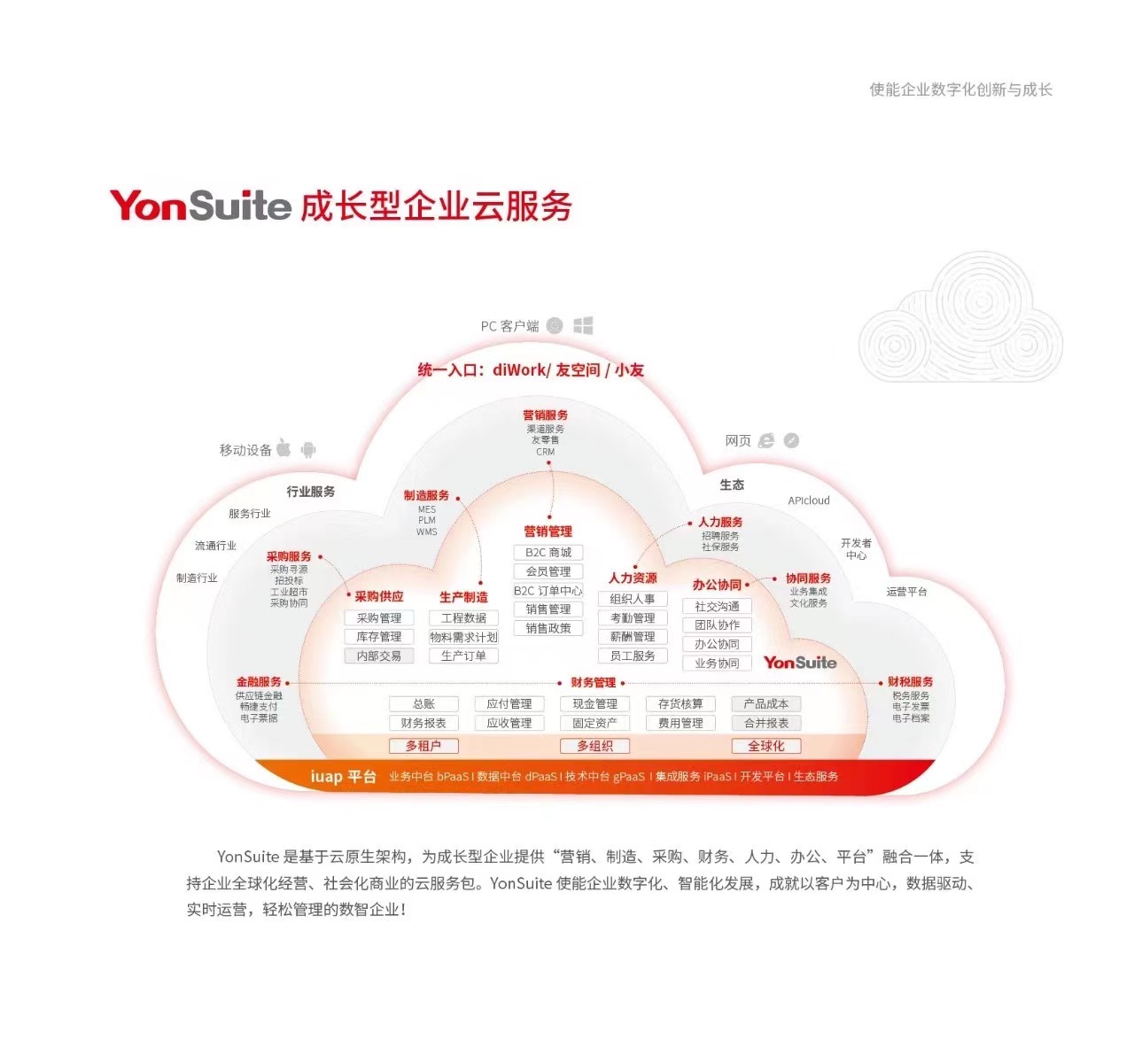 YonSuite為成長型企業(yè)提供“營銷、制造、采購、財務(wù)、人力、辦公、平臺”融合一體的云服務(wù)品牌。實現(xiàn)營銷電商一體化、產(chǎn)供銷一體化、業(yè)財稅一體化、協(xié)同人力一體化。